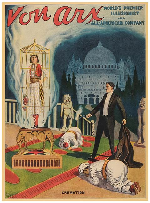 Von Arx (Charles Nicol). Cremation. Color lithograph shows Von Arx conjuring a caged woman atop a table, in front of bowing men. In the background, a Moorish scene emerges from smoke. Framed to an overall size of 34 ½ x 27”. Minor scraping and over-coloring. A-.