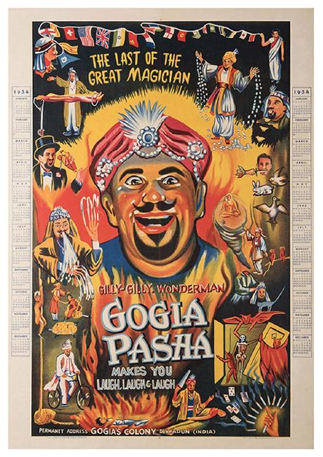 Pasha, Gogia (Dhanraj Gogia). The Last of the Great Magicians. Hong Kong: Sun Sun Printing Works, 1954. Lively and colorful poster of Gogia’s laughing portrait surrounded by vignettes from his show, including his sword suspension and the Indian Rope Trick. On the margins are 12-month calendars for 1954. 33 ½ x 23”. Linen-backed. Old folds visible. A.