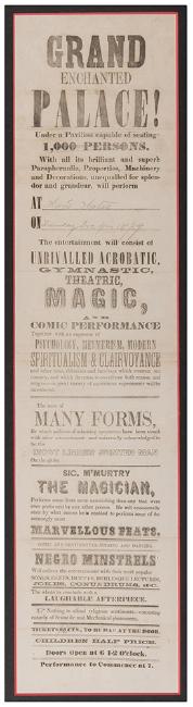 M’Murtry, Sig. Grand Enchanted Palace! N.p., ca. 1839. Broadside announcing “unrivaled acrobatic, gymnastic, theatric, magic, and comic performance.” Framed to an overall size of 27 x 11”. Old folds visible, some fading, small writing visible. B+.
