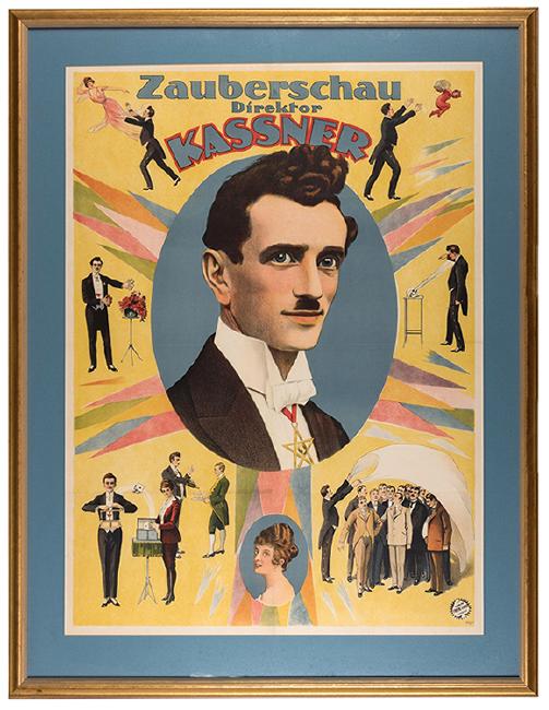 Kassner, Alois. Zauberschau Direktor Kassner. Hamburg: Adolph Friedlander, ca. 1910s. Color lithograph depicting an array of the German illusionist’s acts. In the center is his enlarged portrait. Framed to an overall size of 44 ¼ x 34”. Old folds visible. A-.