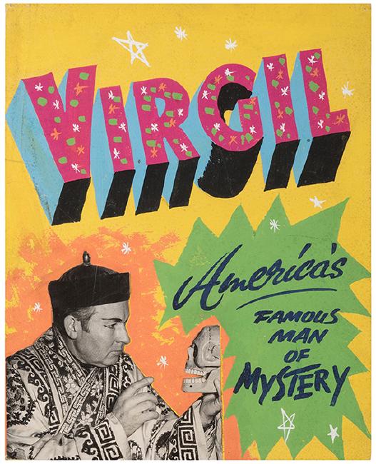 Virgil (Virgil Mulkey). Three Painted Window Cards. N.p., ca. 1950s. Vibrant hand-painted window cards advertising “America’s Famous Man of Mystery” and his assistant and wife, “Julie the Psychic Enigma”. Collaged photographs feature Virgil’s psychic skull and performance scenes. Largest 18 ½ x 15”. Some wear in margins. good.