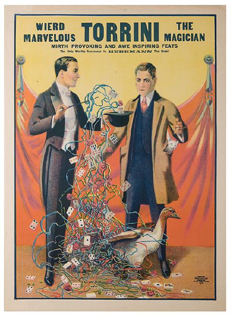 Torrini. Weird Marvelous Torrini the Magician. Chicago: National Printing and Engraving, ca. 1900. Full-color lithographic poster claiming Torrini to be “The Only Worthy Successor to Hermann the Great” as he conjures ribbons, cards, and a live goose from a spectator’s hat. Misspelled as “Wierd”. 28 x 20”. A. A French performer by the name of Torrini (Count Edmond de Grisy) was active in the early 1800s, famous for early performances of sawing a woman in half and the bullet-in-mouth trick. It is likely that the performer depicted in this poster simply adopted the name. A third performer under the alias Torrini was known to perform escapism, during the height of Houdini’s popularity.