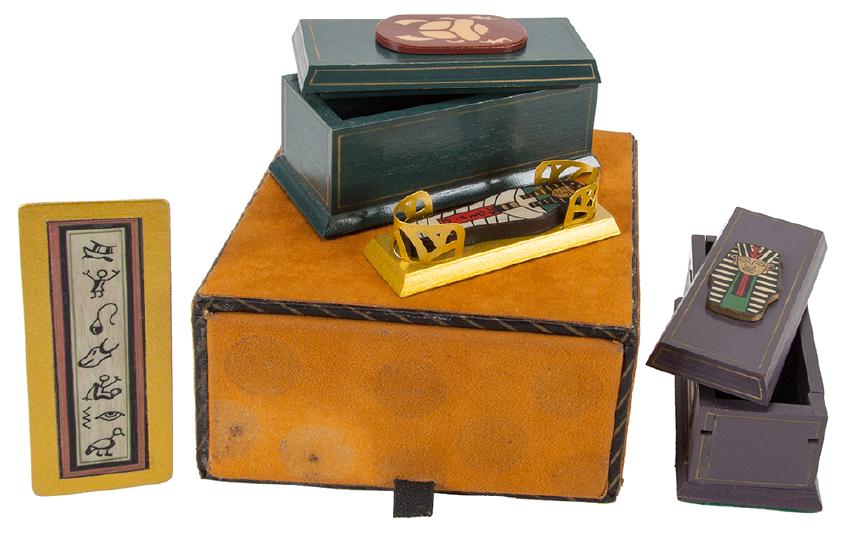 The Mummy (Prototype). Holland: Eddy Taytelbaum, 1950s. A tiny hand-painted laminate mummy vanishes from one sarcophagus and reappears in another. Sarcophagi made of wood, in purple and blue, with gold detailing and reverse-painted laminate decorations on lids and sides. With carrying case of cardboard and felt. Case 4 ¾ x 2 ½”. Slight wear on felt; overall near fine. This is the first set of Mummies that Taytelbaum ever produced. There are several details distinguishing this prototype from later examples of the trick, including the laminate pharaoh’s unique headdress and the style of finely crafted felt case.