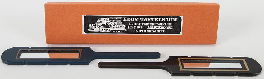 Money Paddle (Set of Two). Holland: Eddy Taytelbaum, ca. 1970. Coins multiply and vanish when rubber-banded to the paddles. Inlaid mirror on one side of each paddle. One in blue, one in black, with gold detailing. 6 ¼” long. Original box. Minor wear on detailing, else near fine.