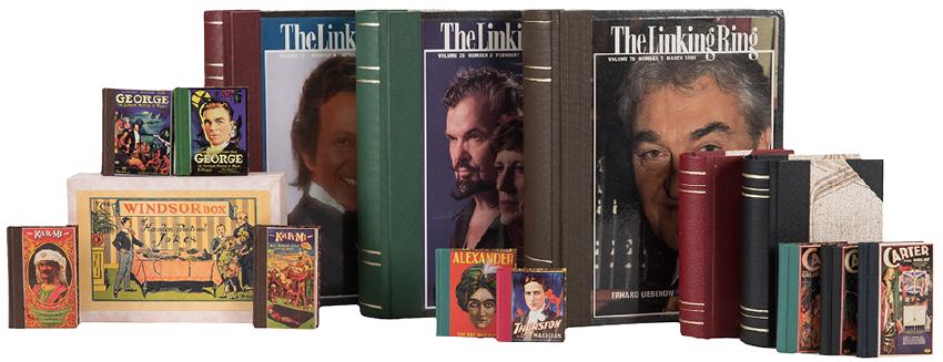 Magic Books. Holland: Eddy Taytelbaum, 1970s. Five clamshell boxes and nine wee books constructed by Taytelbaum. Many feature pictorial covers reproducing magic posters of Carter the Great, Kar-Mi, Alexander, and Thurston. Largest book 9 x 7 ½ x 2 3/8”, the smallest 1 ¾ x 2”. Fine.