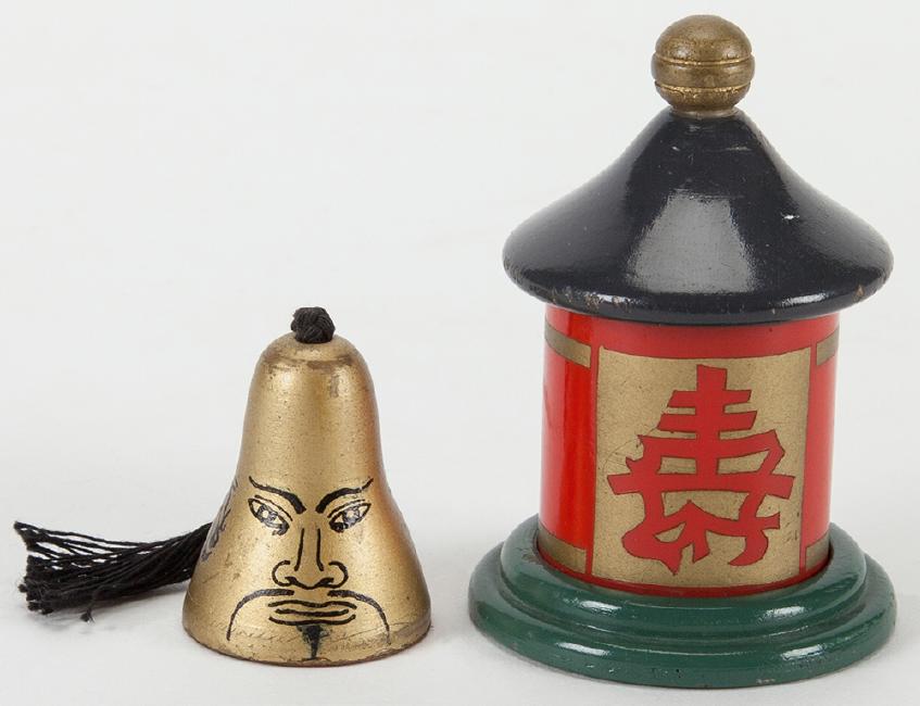 Kong Hi. Holland: Eddy Taytelbaum, 1950s. A Chinese idol figurine jumps out of a wooden temple to pick up the magician’s chosen card. Painted by hand and believed to be the only one of its kind that was made. With a vial of extra metallic shavings. Temple 2 ½ x 1 ½”, figure 1 ¼ x 1”. Minor chipping on painted wood; very good. From the Rinkhuysen collection.