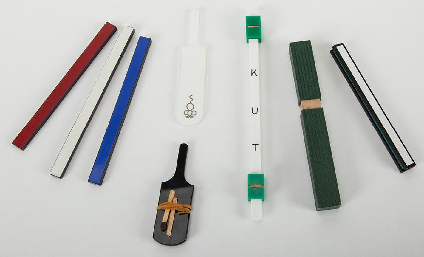 Group of Seven Plastic Paddle Tricks. Holland: Eddy Taytelbaum, 1970s. Including one quad color change paddle with box, one TUK paddle, three color sticks, one duplicating paddle with a match, and one mouse paddle. Longest 5 ½”. Fine.