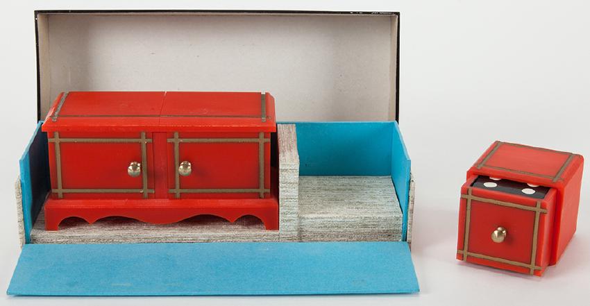 Die Box and Drawer Box. Holland: Eddy Taytelbaum, 1970s. Mitered miniature plastic boxes with gilt inlays and brass knobs, and black dice. A black die vanishes from the larger box and appears in the drawer, which had been previously empty. With a patterned cardboard box. Larger box 4 x 2 ¼ x 1 5/8”, drawer 1 ¾” square. Fine. This is a significantly larger version than any other examples of this effect produced by Taytelbaum.