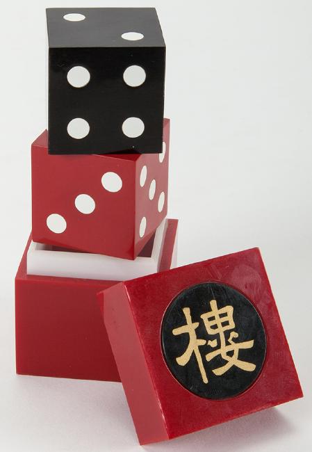 Jewel Die Box. Holland: Eddy Taytelbaum, 1970s. A pair of dice, one black and one red, change colors while kept inside the box. Plastic box decorated with a hand-painted Chinese character. Box 2 x 1 ¾ x 1 ¾”, dice 1 ¼” square. Fine.