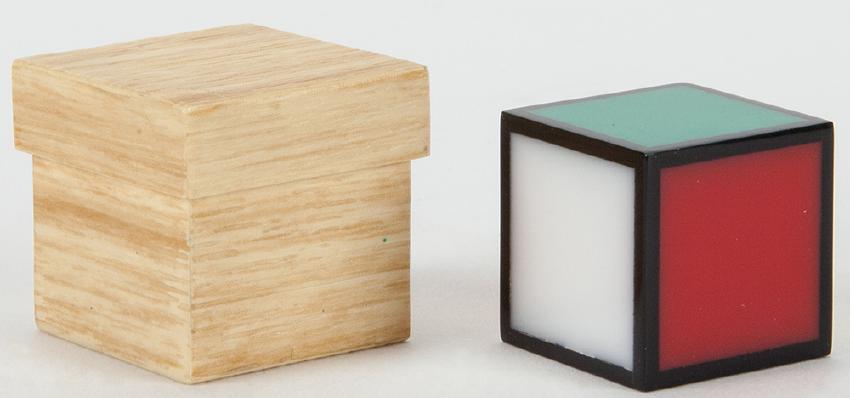 Color Vision. Holland: Eddy Taytelbaum, 1970s. A small cube with different colors on all sides, held in a plastic, wood-patterned box with lid, for an unknown effect. Box features finely inlaid edges. Cube ¾”. Fine.