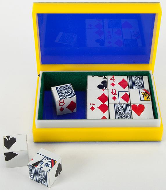 Computer Card Box. Holland: Eddy Taytelbaum, 1970s. Vibrant, two-tone plastic case holding a set of wooden blocks, which are decorated with cut-out playing cards. When shaken, the blocks magically rearrange to form a Queen of Diamonds. 4 ¾ x 3 x 1 ½”. Fine.