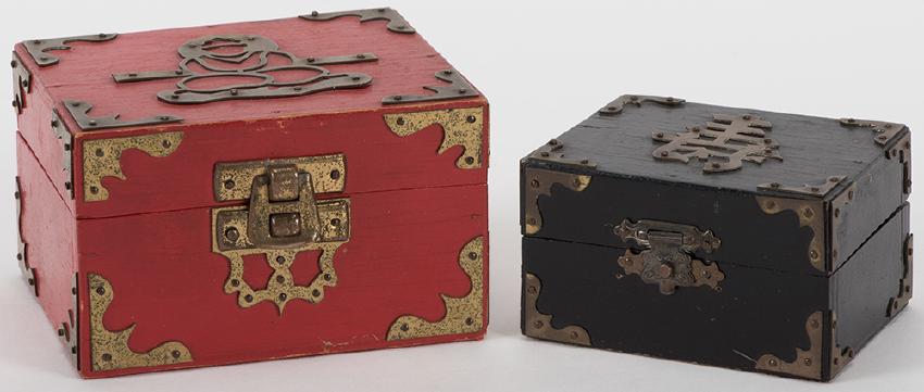 Chinese Nesting Boxes. Holland: Eddy Taytelbaum, ca. 1950. Pair of nesting wooden boxes with copper emblems and trim. The copper emblems were cut by hand, and carefully shaped, one to a likeness of the Buddha, the other a Chinese character. Larger red box 3 ½ x 2 ¼ x 3”, smaller black box 2 ¾ x 1 ½ x 2 ¼”. Minor wear to paint and copper; very good. The nesting boxes represent some of the first items Taytelbaum constructed in earnest, produced when he first moved to Holland. The emblems featured here appear on many of his later products, such as the Pagodas and Ring Boxes.