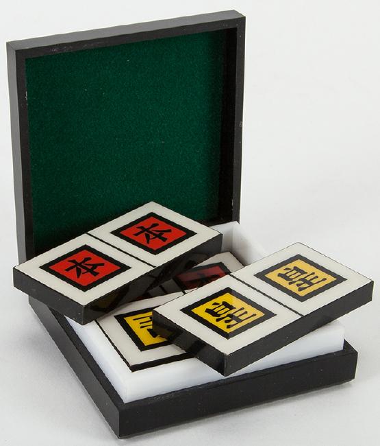 Chinese Domino Set. Holland: Eddy Taytelbaum, ca. 1960s. Five reverse-painted plastic domino tiles, three in yellow, two in red, which transpose from place to place. With felt-lined plastic carrying case, featuring a Chinese character on the lid. Dominoes 2 3/8 x 1 ¼ x ¼”, case 3 x 7/8”. Fine.