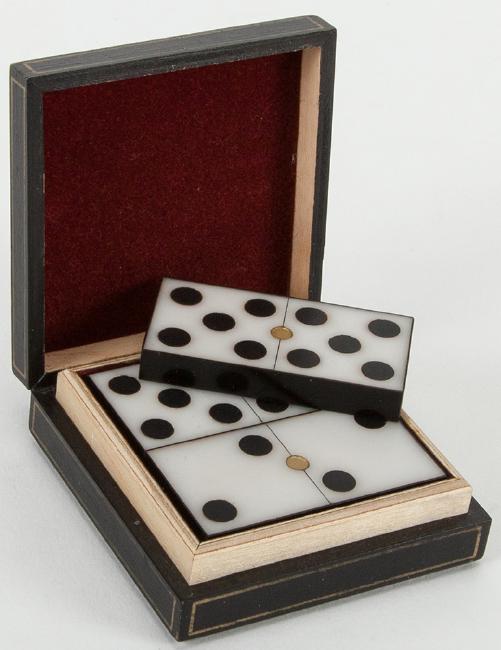 Domino Set. Holland: Eddy Taytelbaum, ca. 1970. Five handmade reverse-painted plastic laminated dominos, one gimmicked. Dominos transpose magically from place to place. Dominos feature inlaid spots and held in a wooden case, with gilt detailing. Dominoes 1 5/8 x 7/8”, case 2 x ¾”. Fine. From the Rinkhaisen collection.