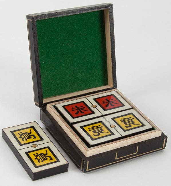 Dizzy Dominoes (Chinese). Holland: Eddy Taytelbaum, 1950s. Five reverse-painted laminated domino tiles, three in yellow, two in red, which transpose from place to place. Felt-lined wooden carrying case, featuring gilt detailing. Dominoes 1 5/8 x 7/8”, case 2 x ¾”. Fine.
