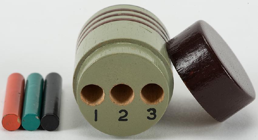 Divining Rods. Holland: Eddy Taytelbaum, 1960s. A round wooden box that, when opened, displays three numbered holes, each containing a colorful metal rod. The magician identifies the arrangement without looking inside. Wooden box 1 ½ x 7/8”. Fine.