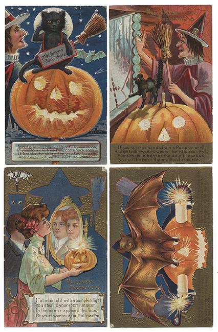 Sixteen Halloween Postcards. Various publishers, 1900s—10s. Including "Halloween Precautions" Series No. 2 [4]; "Jolly Halloween" Series No. 4 [4]; "Halloween" Series No. 3 [3]; "Halloween" Series No. 5 [2]; and three cards designed by Ellen Clapsaddle. Condition very good overall.