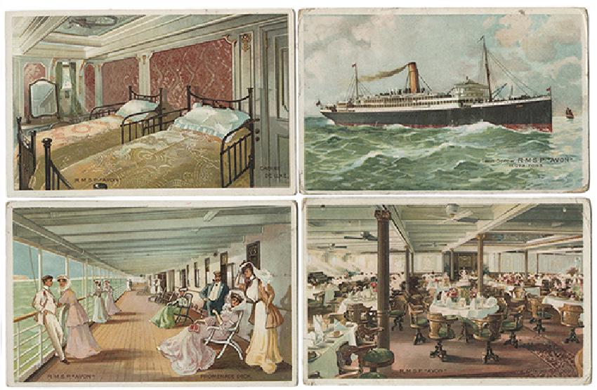 Lot of 59 Vintage Postcards. Various publishers. Including The Royal Steam Packet Company postcards of cruise ships [9], Marque L=E Paris, postcards of women by various artists [9] Edward Gross postcards of children by C.H. Twelvetrees [4], Wilkinson’s Tansan Water postcards of Japanese subjects [14], and 13 others.