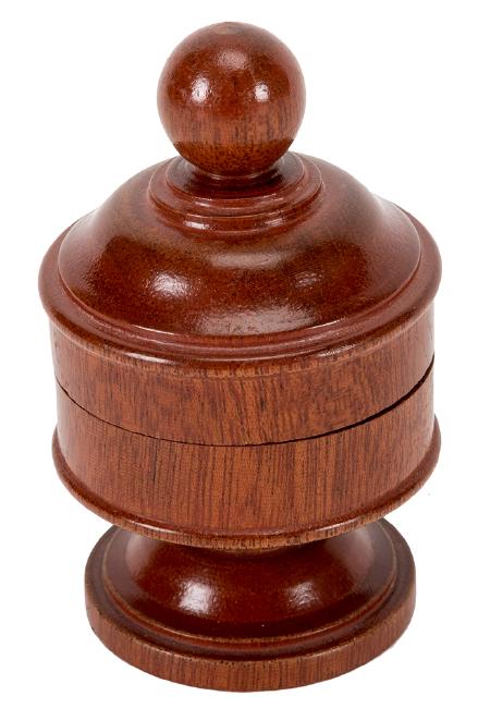 Coin Vase. Lake Forest: John McKinven, ca. 1997. Finely turned hardwood vase changes one coin to another when the lid is placed over the coin and removed. 3 ½” high. Hallmarked. Fine. The only example of this prop known to be made by McKinven.