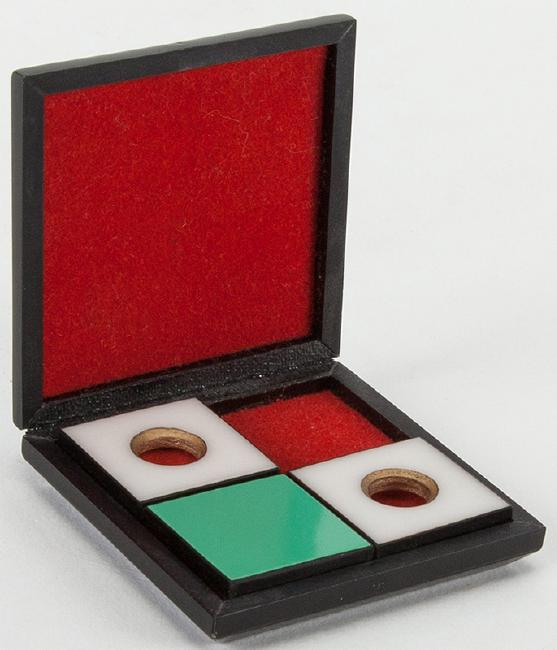 Traveling Nut. Holland: Eddy Taytelbaum, ca. 1970. A small green tile and a white “nut” transpose magically, from inside a small box to the magician’s pocket, and back again. Box 1 ¾” square, nut and tile ¾” square, all plastic. Fine.