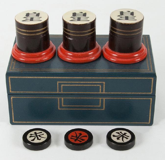 Three Chip Monte. Holland: Eddy Taytelbaum, 1960s. Three plastic tubes with magnetic lids and matching chips used in the classic swindle game. Held in a wooden box, painted blue with gold detailing. 1 ½ x 3 ½ x 2”. Fine. This effect was produced for J.H. Van Rinkhuysen, and known to be the only one of its kind Taytelbaum made.