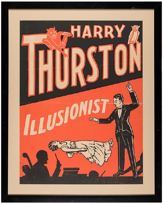 Thurston, Harry. Harry Thurston. Illusionist. American, ca. 1930. Two-color poster depicting the magician, brother of Howard Thurston, levitating a woman, with silhouettes of orchestra members in the foreground. 28 x 21". Framed. Minor marginal wear, slight losses along folds.