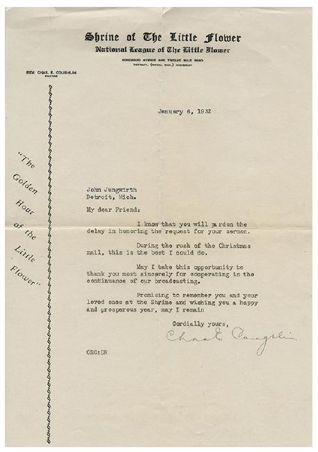 [Radio] Coughlin, Charles. Father Coughlin Typed Letter Signed, With a Collection of Radio Sermon and Lecture Booklets. Including a January 1932 typed letter signed, "Chas E Coughlin", together with dozens of booklets of radio sermons and lectures by Coughlin (Radio League of the Little Flower, 1930s), and several form letters and mailed matter.