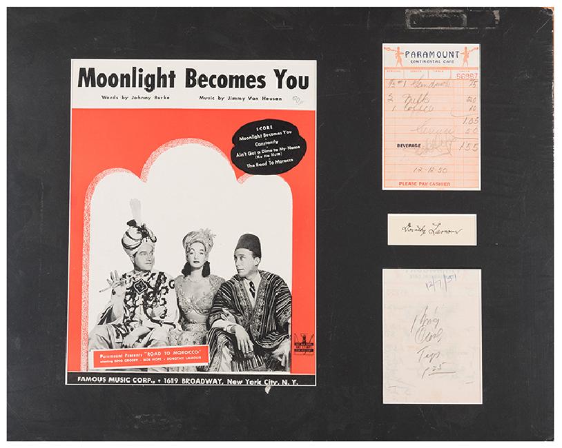 [Film] Three Autographs: Bob Hope, Bing Crosby and Dorothy Lamour. Matted with the sheet music score for Moonlight Becomes You, from the film Road to Morocco, which stars Lamour, Hope and Crosby.