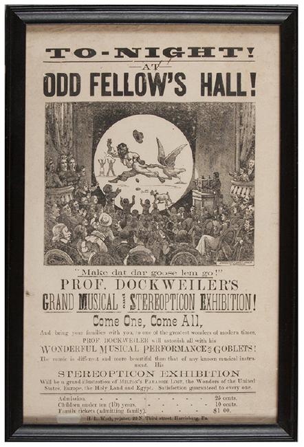 Broadside Advertisement for a Stereopticon Exhibition at Odd Fellow’s Hall. Harrisburg, n.d. 12 x 18".
