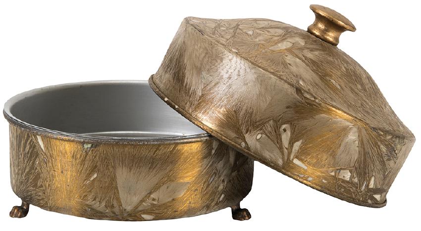 Double-Load Dove Pan. New Haven: Petrie and Lewis (P&L), ca. 1950. Empty metal chafing dish (approx. 8 x 4") magically fills with live birds after the lid with which it has been covered is removed. A second production can then be made, once again filling the pan. Claw feet. Golden crackle paint. Hallmarked twice.
