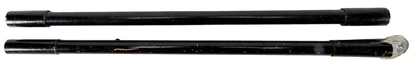 Coin Wand. Boston: C. Milton Chase, ca. 1900. Mechanical wand produces coins at its tip repeatedly. With duplicate ungimmicked wooden wand. Chase palming coin. 15” long. Chipped paint. Uncommon.