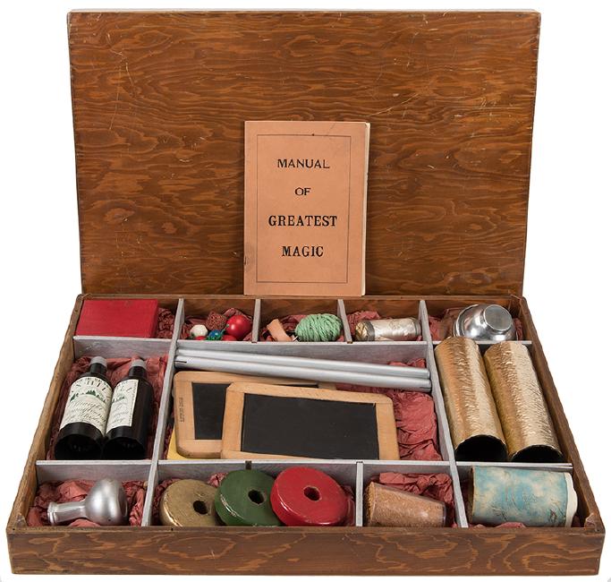 [P&L] P&L “Deluxe” Magic Set. New Haven: Petrie & Lewis (P&L), ca. 1939. Large and elaborate magic set includes many P&L products, among them the Passe Passe Bottles, Card Box, glass Hindu Jug, Bran Glass, Rice Bowls, Coin in Ball of Wool, and many others. Case 23 x 16 ½”. With instructions (two booklets, one loose set), and vintage 8 x 10” photograph of a similar P&L set. An example of one of the largest and most expensive magic sets produced by Petrie & Lewis, sold by the firm’s magician-demonstrators at Abercrombie & Fitch in Manhattan in the 1930s.