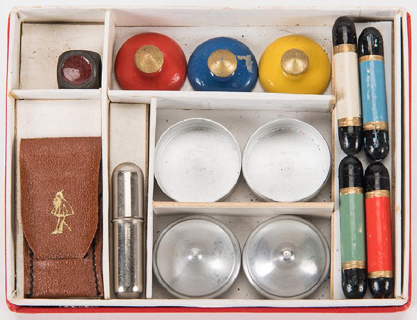 [Magic Set] Miniature Klingl magic set. Vienna: Zauber-Klingl, ca. 1950. Includes aluminum coin box, divination tricks, and more. One small item hallmarked with the Klingl logo. Box 5 ¼ x 4”. Paint flaking on two pieces, else good.