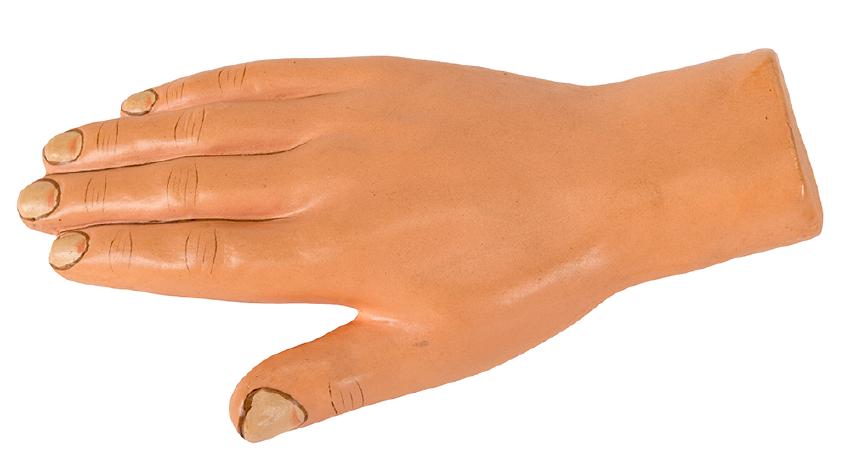 Spirit Rapping Hand. London: Davenport’s, ca. 1920. Papier-mache model hand (approx. 6” long) mysteriously raps out answers when placed on a pane of glass. Hand painted.