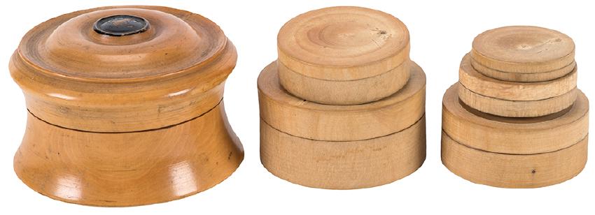 Nest of Boxes. Circa 1890. Set of six lathe-turned wooden boxes. A coin vanishes, only to reappear in the smallest of the containers. Smallest box holds an American penny. Largest box 2 " diameter.