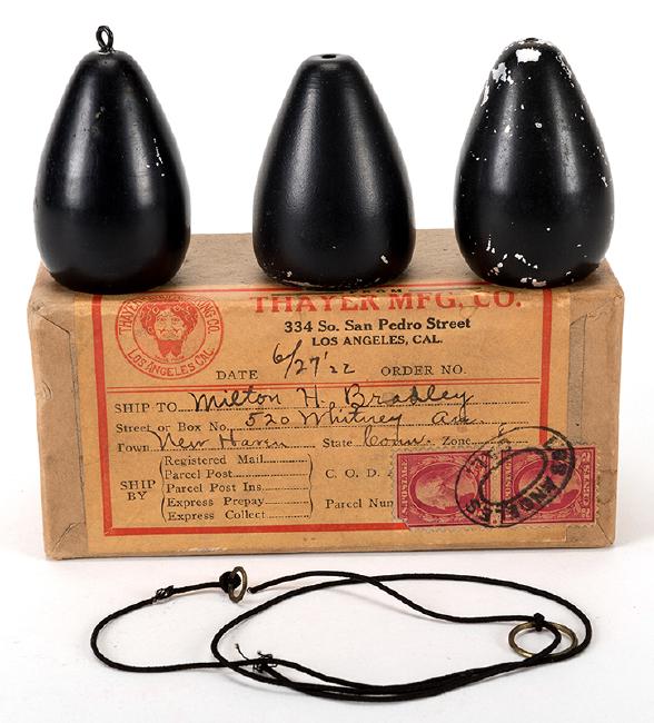 Handkerchief Pull. Los Angeles: Thayer, 1922. Pear-shaped black metal devices worn by the magician, facilitating a handkerchief vanish. Instructions included with original mailing box.