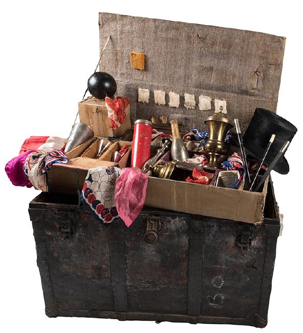 Germain (Charles Mattmuller). Magician Karl Germain’s “Work” Trunk and Magic Apparatus. Circa 1905. Massive metal-bound traveling trunk owned and used by famed Chautauqua and Lyecum magician Karl Germain. The interior contains three trays, two still laden with apparatus and tools of the magician’s trade. Among the objects included are a fine Beaver top hat with internal compartment for transforming one object into another, a large spun brass Rice Vase, various sets of Diminishing and trick cards (several with metal gimmicks), fine and large brass Card Tripod/pedestal, a heavy candlestick with secret spring-loaded mechanism for rotating the top of the stick, a large and heavy wooden obedient ball, a fine crystal Spirit Bell with ringer in padded wooden case, as well as several magic wands, and various packs of cards and card tricks. Two of the latter are in boxes addressed to Frederick Eugene Powell, Germain’s contemporary. Germain’s name has been painted on the sides of the trunk in bold, white paint, now faded. Trunk manufactured by the Likly & Rockett Co. of Cleveland, Germain’s home town. Overall dimensions of 36 x 22 x 25”. Exterior of trunk brittle and cracked, especially bottom panel. Accompanied by two letters from Paul Fleming to John Henry Grossman related to the trunk and specifically mentioning Germain’s hat for “switching.” A unique and special relic from one of magic’s great inventive minds. Address labels on the trunk clearly trace its ownership, from Germain to