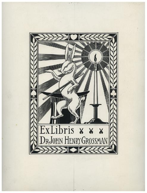 Williams, Ira C. Bookplate Illustration Art for Dr. John Henry Grossman. Connecticut, ca. 1950s. Pen and ink on artist’s board. Illustrated area 7 x 5”. Together with a folder of draft pencil sketches on tissue paper, proof prints of the plate, and several Christmas greeting cards produced by Grossman. The artist was one of the chief illustrators for Petrie-Lewis. The Grossman bookplate is laid inside many of the books and periodicals in this section.