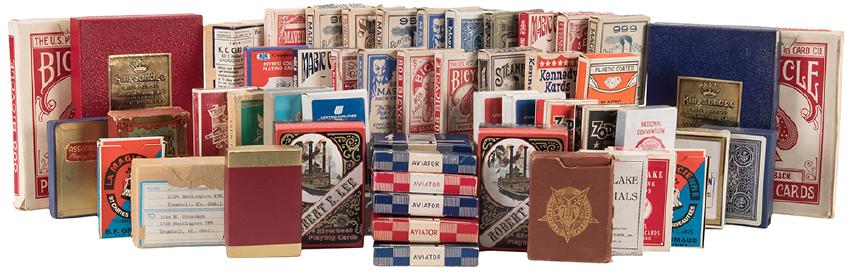 Magician’s Collection of Vintage Playing Cards. Approximately 50 decks, 1900s—80s, many prepared for magic tricks, and including decks issued by K.C. Card Co., USPC (various Bicycle Steamboat, and other varieties), A. Dougherty, Sherms, Russell & Morgan, Magic Castle, various airlines, jumbo decks, Aviator, commemorative issues, and others. Decks not checked for completeness, but appear neatly organized and well kept.