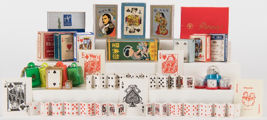 Magician’s Collection of Vintage Miniature Playing Cards. Approximately 20 pieces, including a fingernail-sized set of Diminishing Cards accompanied by an old note attributing them to Martinka & Co., a 14k gold miniature playing card keychain box, several sealed card game sets imported from China, sealed Piatnik decks and other imported decks, plus doll-house and keychain decks.
