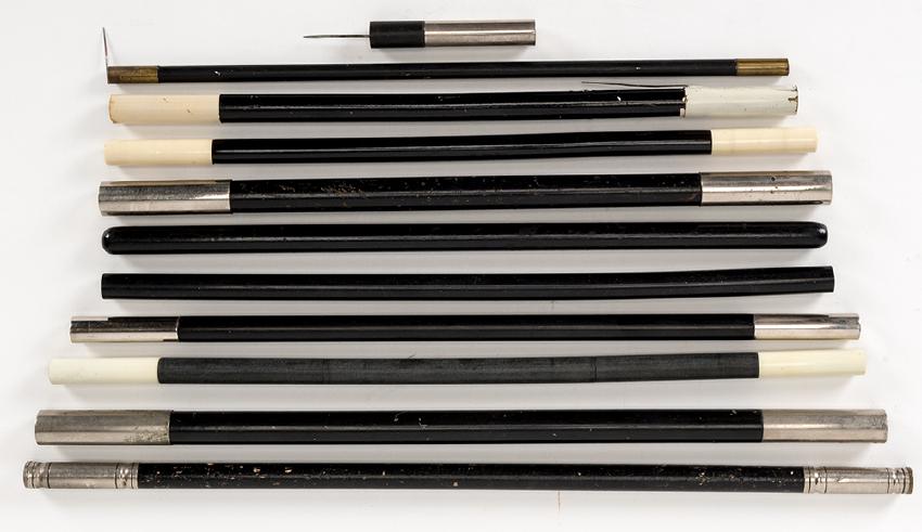 [Magic Wands] Group of Eleven Vintage Magic Wands. 1910s – 50s. Gimmicked and ungimmicked, and including unusual examples of the Jumping Wand, a small Catalin wand by Willmann of Hamburg, folding wand, Handkerchief Vanishing Wand, wand with concealed compass, and others. The longest 16 ½”. Generally good condition.