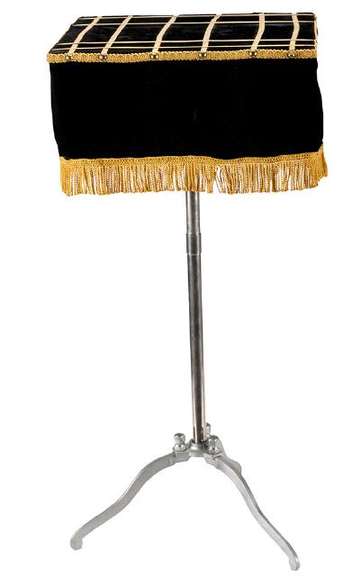 Magician’s Side Table. New Haven: Petrie & Lewis (P&L), ca. 1939. Portable magician’s table with folding cast aluminum legs. Plush-covered top includes one black art well. 29” high. Hallmarked.