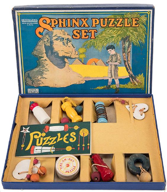 Sphinx Puzzle Set. New Haven: Petrie & Lewis (P&L), ca. 1940. Attractive set includes paper, wooden, and metal puzzles. With instruction book and later “Sambo” puzzle. 12 ¼ x 8 ¾” x 1”.