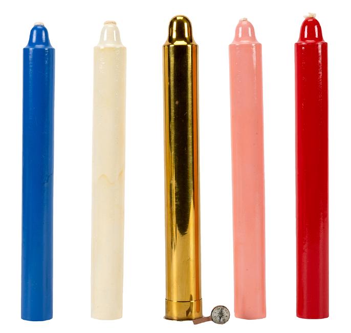 The Great Aladdin’s Candles. New Haven: Petrie & Lewis (P&L), ca. 1930. One of four candles is hidden in a brass tube. The magician instantly knows its color. Candles 7” long. With original gimmick and later instructions. Uncommon.