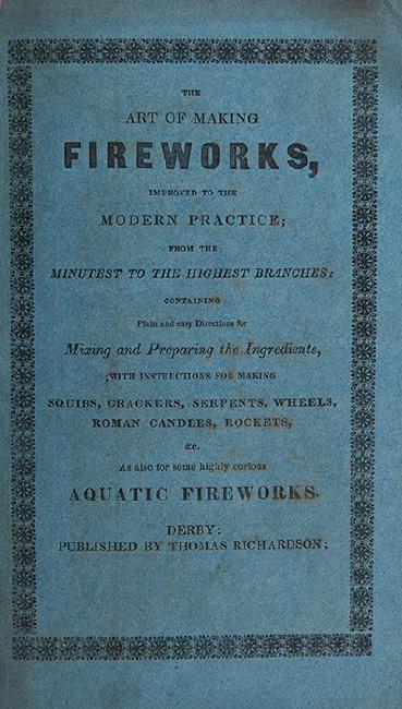 [Fireworks] Grotz, Christopher. The Art of Making Fireworks. Derby: Dean and Munday [ca. 1825]. First edition. Hand-colored folding frontispiece. Marbled boards. Original blue wraps bound in. 8vo. Scarce.