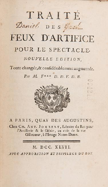 [Fireworks] Frezier, Amedee-Francois. Traite des feux d'artifice pour le spectacle. Paris: Charles Jombert, 1747. New edition. With engraved title page and thirteen folding engraved plates. Full calf. 8vo. Manuscript ex-libris, blindstamp and inventory number to title page and bookplate (Major C.J. Brandling, 2nd W. New York Militia) to the front pastedown. Spine rebacked, retaining boards (worn). A few pages starting to detach, others toned, blindstamped inventory number to title page.