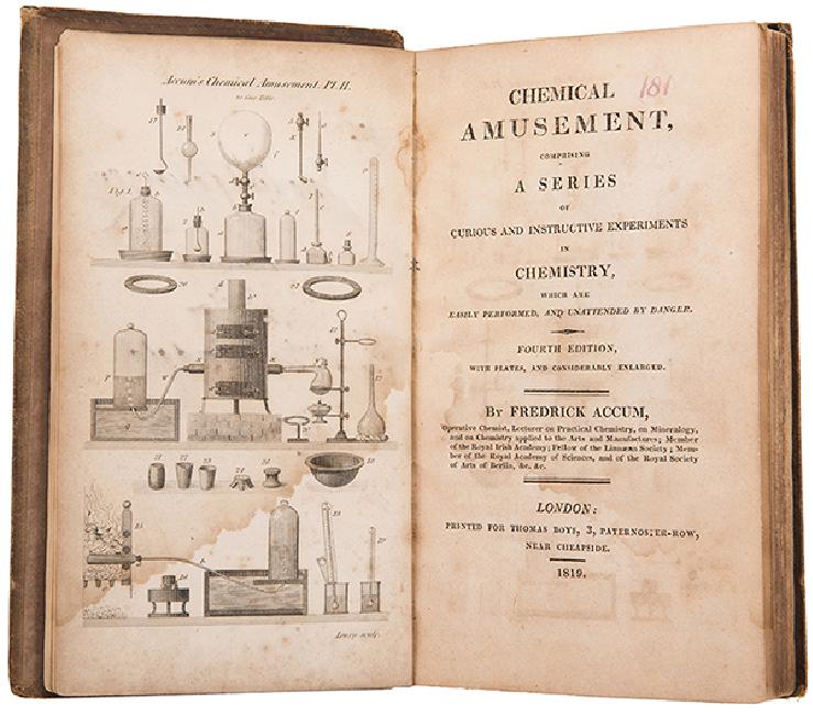 [Chemistry] Accum, Frederick. Chemical Amusement, Comprising a Series of Curious and Instructive Experiments in Chemistry… London: for Thomas Boys, 1819. Fourth edition. Complete with two engraved plates (frontispiece; p. 344). Early cloth. 12mo. Dampstaining to first 48pp. Upper board detached, others rubbed, offsetting from frontispiece. Toole Stott 4.