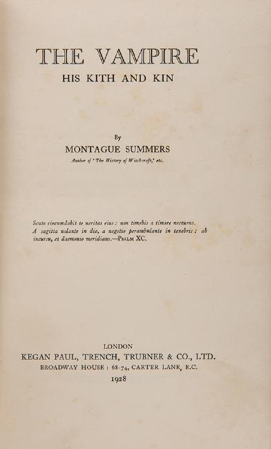 Summers, Montague. Two Volumes on Supernatural Subjects. Including The Vampire: His Kith and Kin (London, 1928) and The Werewolf (London, 1933). First editions. Halftone frontispieces, plates. Cloth. 8vo. Shelfworn, but clean internally.