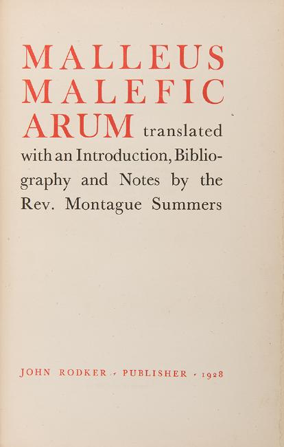 [Witchcraft] Summer, Montague (trans. ) Malleus Maleficarum. Bungay: John Rodker, 1928. Limited edition. Number 1,086 of 1,279 copies printed on Dutch paper. Frontispiece. Red imitation calf spine over gilt-stamped buckram. 4to. Deckled edges. Light rubbing to boards, wear to spine ends, hinges tender, bookplate to front pastedown.