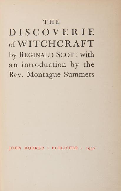 [Witchcraft] Summer, Montague (trans. ) The Discoverie of Witchcraft. [Bungay]: John Rodker, 1930. Limited edition. Number 942 of 1,275 copies printed on Dutch paper. Quarter red cloth over green boards. Deckled edges. 8vo. Light wear to boards, hinges tender, bookplate tipped in front pastedown.